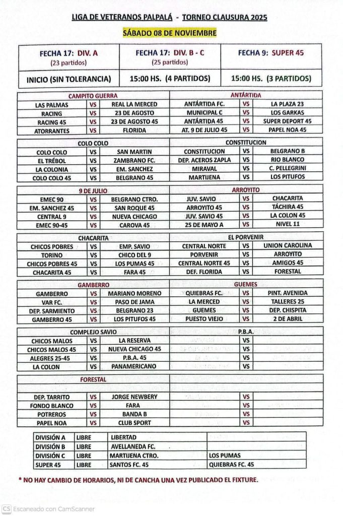 Liga de Fútbol Veteranos Standar Palpala CATEGORIA A,B,C 45 Programa de Partidos Sábado 08 de Noviembre