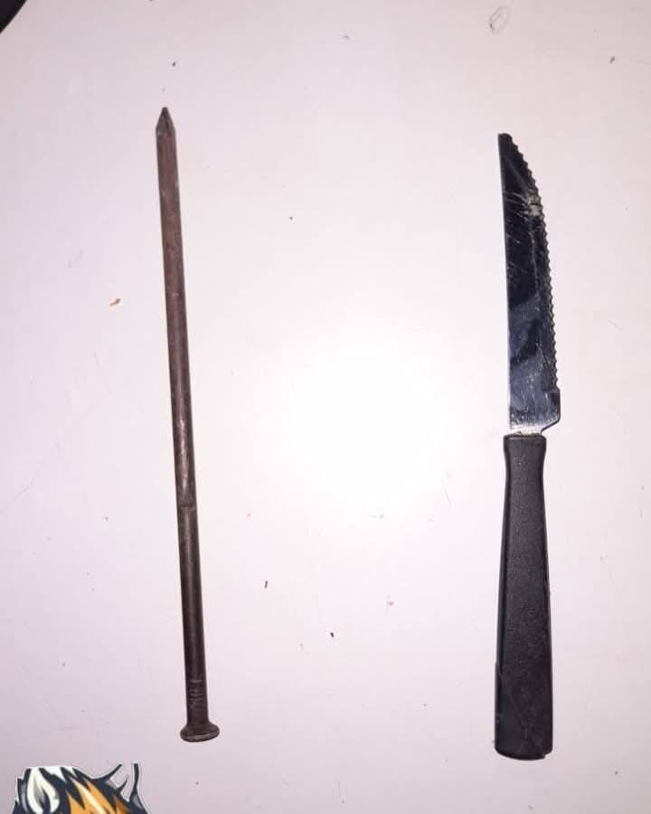 Al momento de realizar el palpado superficial, secuestran entre sus pertenencias una punta metálica de 20 centímetros y un cuchillo sierrita, siendo inmediatamente trasladado a la dependencia policial.
