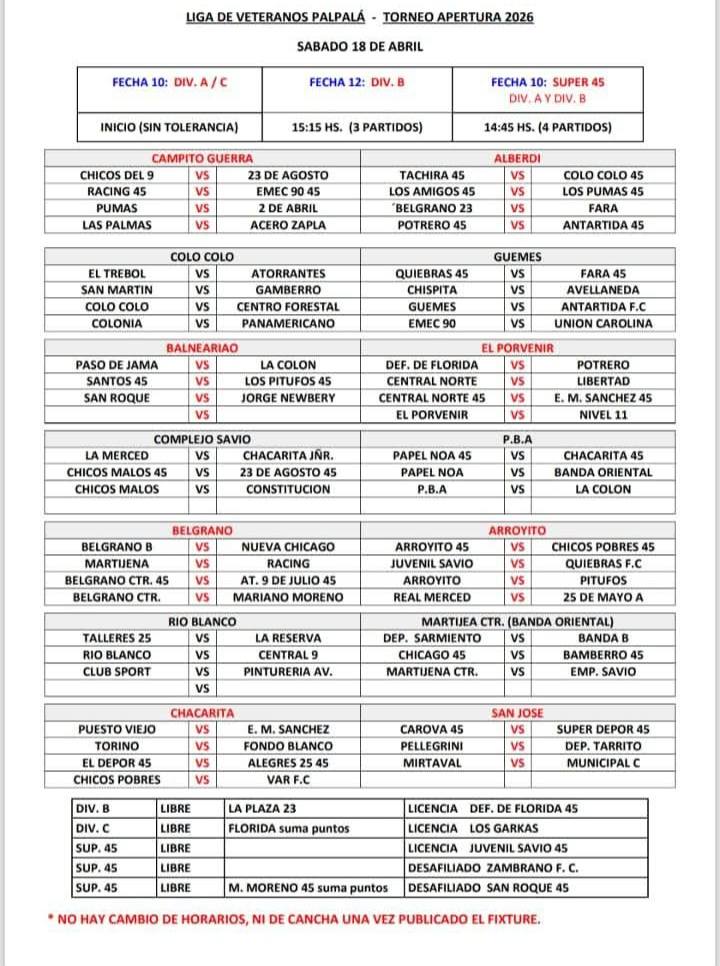 Liga de Futbol Veteranos Standar PalpalaCatwgoria A, B, C y 45Programa de Partidos Sabado 18 de Abril
